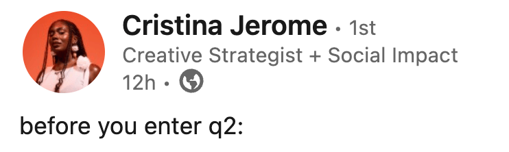 smart advice from Cristina Jerome that revolutionized the end of a bustling q1 for me: