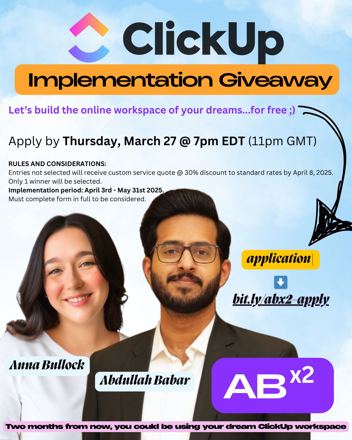 Enter for a chance to win FREE implementation support in building your online ClickUp workspace from Anna (your business Mom) and Abdullah Babar (ABx2)